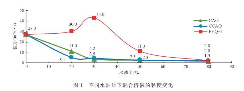 將CAO、CCAO和FHQ-I分別與現(xiàn)場采集的黏度約為27mPa·s的原油進行混合,配置成200ml混合溶液,用六速旋轉(zhuǎn)黏度計在200r/min的條件下,對水油比分別為20%、30%、50%和80%的混合溶液的黏度進行測量,結(jié)果如表3和圖1所示。