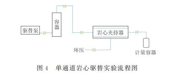 將3塊巖心抽真空后,飽和原油,根據飽和油的體積計算巖心孔隙度;將飽和好油的巖心在地層溫度下恒溫放置48h;使用標準鹽水進行水驅油,采出液含水率達到98%以上時停止,然后在地層溫度(30℃)下分別使用配制的CAO、CCAO和FHQ-I繼續以0.5PV的體積驅油,接著水驅直至含水率達到98%,計算出油體積,記錄驅替過程中壓力變化及采出液中的含油量,計算各階段采收率,結果見表6,驅替實驗流程如圖4所示。