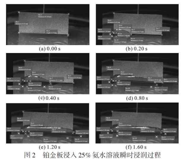 圖2 鉑金板浸入25%氨水溶液瞬時浸潤過程