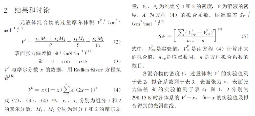 式 (2)、 (3)、 (4)中, x1、 x2分別為組分1 和2的摩爾分數(shù), M1、 M2分別為組分1 和2 的摩爾質(zhì)量, ρ1、 ρ2為純組分1 和2 的密度, ρ為溶液的密度, Ai為方程 (4)的擬合系數(shù)。標準偏差 SVE(cm3·mol-1)[ 13]