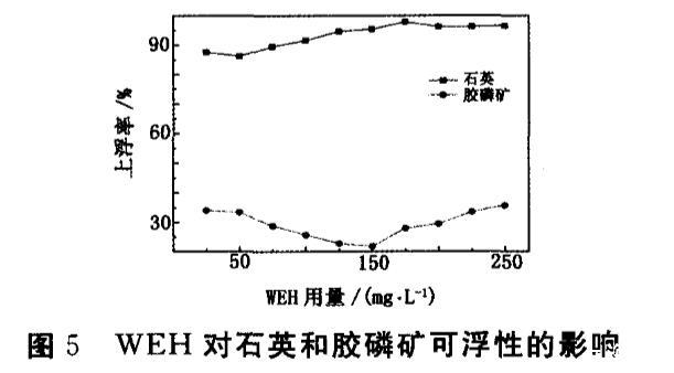 試驗(yàn)采用WEH作為脫硅增效劑,這種增效劑是在淀粉的活性基團(tuán)上增加了醚胺基團(tuán)使其易吸附于石英礦物顆粒表面,淀粉具有一定的分散作用,因此WEH是分離膠磷礦和石英較好的調(diào)整劑。試驗(yàn)采用ZB和磷酸混合作為膠磷礦抑制劑,ZB用量為150 mg/L,磷酸用量為80 mg/L,考察WEH用量對膠磷礦和石英上浮率的影響,結(jié)果見圖5。