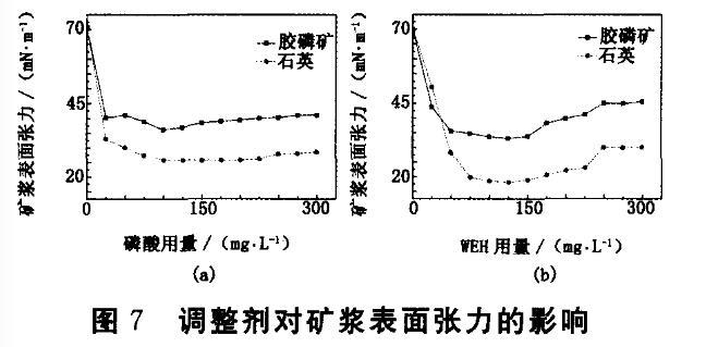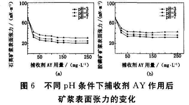 本研究對多種調(diào)整劑作用下石英和膠磷礦的可浮性進(jìn)行了考察,并通過表面張力分析說明礦漿表面張力的影響及捕收劑AY在礦漿中的活性,但還需要在以后的研究工作中進(jìn)一步探討捕收劑在石英和膠磷礦表面的吸附機(jī)理。