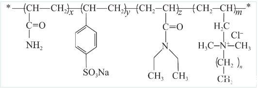 針對上述問題,亟需開發一種高耐鹽、耐鈣鎂、耐剪切、低傷害的聚合物稠化劑,滿足氣田水、返排液規模化回用需求。研究表明,在分子結構中引入特定基團是實現聚合物功能化的常用方法,例如引入磺酸基提升耐鹽性;引入剛性基團提高耐溫耐剪切性能;引入陽離子基團能夠減弱金屬離子的屏蔽效應,提高聚合物耐溫耐鹽特性;引入雙尾疏水單體可形成疏水微嵌段,溶解后有利于形成有序的多氫鍵結構體,可有效提高聚合物的耐鹽和耐剪切性能,膠束結構受剪切破壞后,聚合物分子會迅速進行疏水締合重排,發生二次聚集,具有一定的抗剪切自修復性。