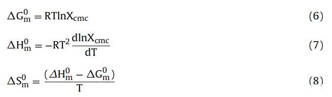 其中αG0m、αH0m和αS0m是自由能、焓的變化 和膠束化熵,Xcmc 是 cmc 處的摩爾分數。 這 從方程 (6-8) 獲得的值顯示在表 2 中。