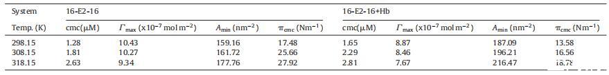 表格1 不同溫度下 Hb 不存在和存在時 16-E2-16 的 cmc、∫max 和 Amin