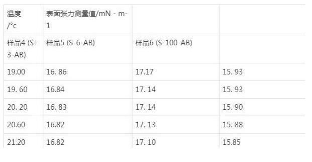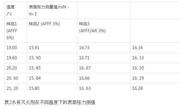溫度條件對于液體表面張力存在著很大的影響。大量試驗數據表明,液體的表面張力會隨著溫度的升高而降低。通過對一系列流體滅火劑產品,包括不同配比的泡沫滅火劑(成膜型)、水系滅火劑等樣品進行測試,可以清晰地從表1、表2中看出,溫度的變化對流體型滅火剤的表面張力存在一定程度的影響。