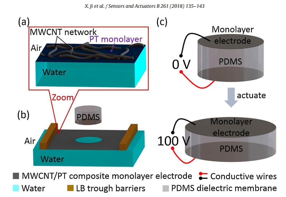 圖1。使用Langmuir-Schaefer轉(zhuǎn)移單層電極制作低壓DEA(a)在空氣-水界面形成的單層復合電極:嵌入聚(烷基噻吩)(PT)單層內(nèi)的互連MWCNT網(wǎng)絡。(b)Langmuir-Schaefer(LS)將復合單分子膜從空氣-水界面轉(zhuǎn)移到PDMS介電膜上,制成DEA的一個電極。(c)DEA由一層1.4μm厚的硅酮膜組成,硅酮膜夾在兩個亞100 nm厚的復合單層電極之間。