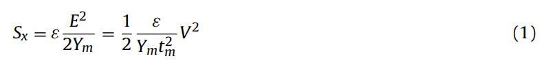 式中,ε是DE膜的介電常數(shù),Ym是DE膜的楊氏模量,E是兩個電極之間的電場,V是施加的電壓,tm是DE膜的厚度。
