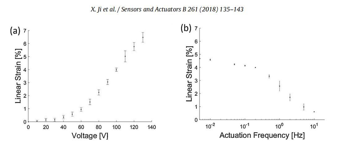 圖8。由1.4μm厚PDMS膜和單層電極組成的DEA的表征。(a)應(yīng)變與電壓曲線,顯示100V時(shí)約4%的線性應(yīng)變。(b)應(yīng)變與驅(qū)動頻率曲線。
