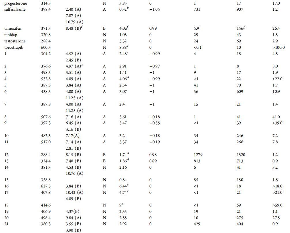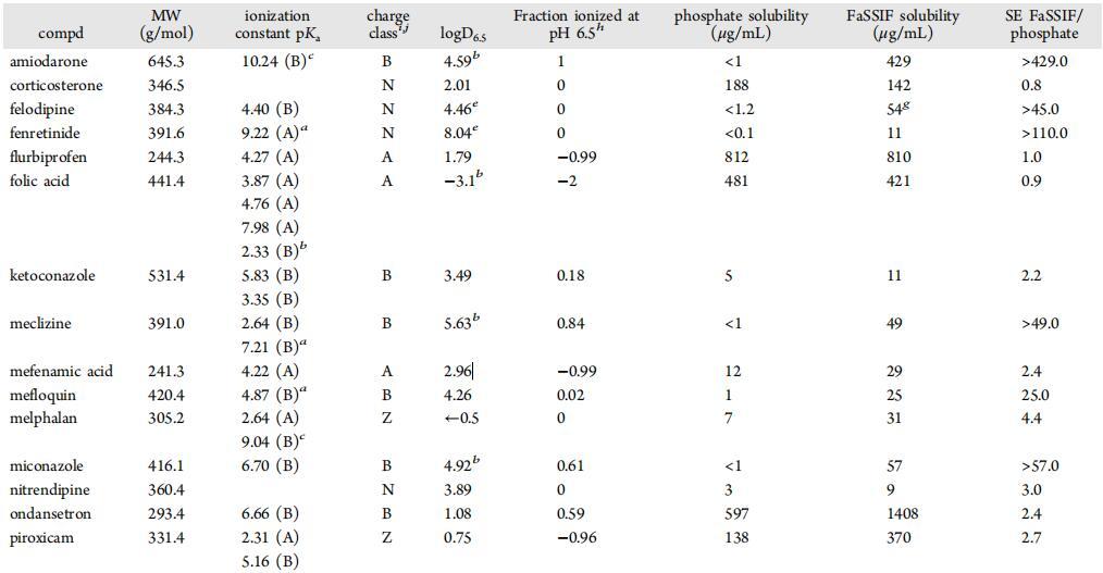 在FaSSIF和水性緩沖液中的溶解度評估和物理化學特性。選擇了一組21種上市藥物和30種來自不同研究項目的羅氏化合物,因為它們在pH值為6.5的水性緩沖液和FaSSIF介質中的溶解度不同。作為標準做法,所有溶解度和表面壓力剖面測量均在室溫下進行,而不是在37°C下進行。盡管溫度可能會影響藥物溶解度、脂質聚集體分配和溶解,據報道,牛磺膽酸膠束的聚集數對溫度變化相對不敏感。19該化合物組包含不同的化學性質、廣泛的親脂性,并涵蓋不同類型和程度的電荷狀態,包括中性、酸性、堿性和兩性離子分子。表1列出了主要理化性質和溶解度數據。