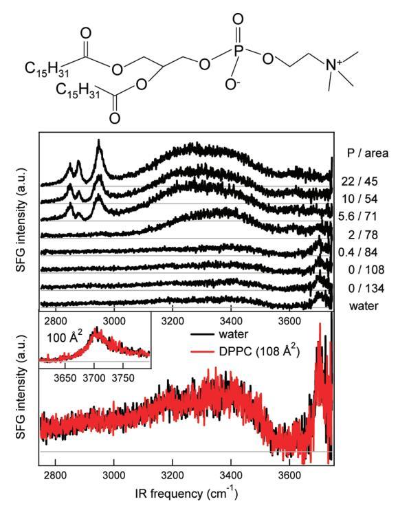 圖1。頂板:DPPC的分子結(jié)構(gòu)。中間面板:裸露水面(底部光譜)和密度增加的水中DPPC的SSP極化SFG光譜。壓力(mN/m)和每個分子的面積(?2)分別從底部到頂部增加和減少,在圖表旁邊給出。每個分子的面積由氯仿溶液滴的數(shù)量控制。CH(2800)?3000厘米?1),氫鍵OH(3000?3600厘米?1),還有免費的哦(~3705厘米?1)拉伸振動可見。底部面板:從裸露水面的中間面板放大,每個分子的DPPC為108?2,以表明它們的相似性。插圖放大了裸露水面和DPPC(100?2)表面的自由OH拉伸振動區(qū)域。在每個分子的這個區(qū)域,壓力仍然低于檢測極限,表面上DPPC的存在顯然不影響自由OH拉伸振動的振幅。相對較高的紅外通量(~10 mJ/cm2)用于本實驗。