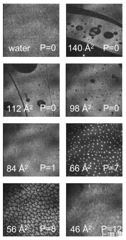 圖3。水上不同密度DPPC的布儒斯特角顯微鏡圖像。圖像大小為600×600μm。白色區(qū)域表示高密度,而黑色區(qū)域表示低密度。在每個面板中,每個分子的面積(單位為?2)在左下角報告,表面壓力(單位為mN/m)在右下角報告。這些照片是用自動調(diào)整靈敏度的相機(jī)拍攝的,這樣就無法比較圖像之間的灰度等級。