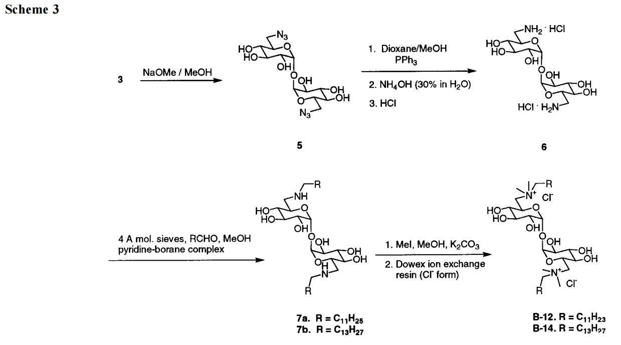 方案2和方案3以及實驗部分詳述了我們獲得A系列和B系列海藻糖雙子的方法。另外幾條評論有助于美化這一信息。B型海藻糖雙子最明顯的先驗途徑是用長鏈?zhǔn)灏分苯尤〈?的甲苯磺酰化基團。盡管沿著這些路線進行了多次嘗試,但只獲得了分解產(chǎn)物或起始材料。然而,如方案2所示,我們成功地用疊氮化合物取代了2的兩個甲苯磺酰化物,得到了3。此處采用文獻程序28,但出于安全考慮,HMPA被DMPU取代作為溶劑。然后,雙疊氮化物3經(jīng)過Staudinger反應(yīng)25,29,在一個步驟中得到長鏈雙酰胺4a-g,而該長鏈雙酰胺4a-g只需脫保護即可獲得a系列雙子。在方案3中,脫保護糖5的疊氮化物還原將化合物轉(zhuǎn)化為二伯胺鹽酸鹽6。長鏈醛與6和吡啶硼烷絡(luò)合物30的還原胺化得到海藻糖衍生物7。使用NaBH3-CN作為還原劑,該反應(yīng)的產(chǎn)率很低。在用甲基碘化物將7甲基化,然后進行離子交換(以促進純化和提高溶解性)之后,我們得到了B系列海藻糖雙子。
