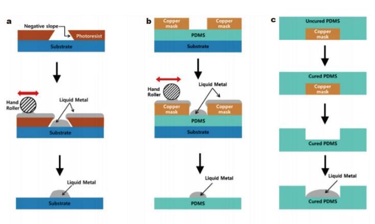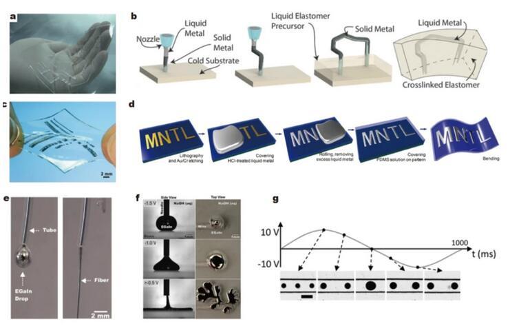 除了某些特定材料的表面(金、銅、錫等)可以潤濕外,使用施加電壓等方法也可以改變液態金屬的潤濕特性,使其在基材表面擴散,在此基礎上可以制造出可拉伸的電子設備。