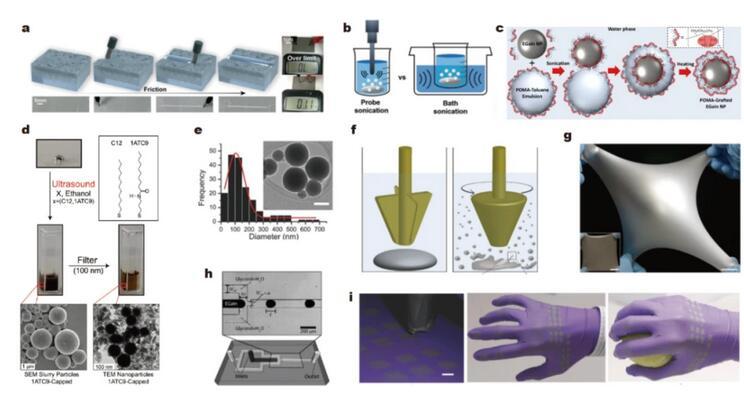 使用超聲和剪切等自上而下的方法將液態金屬從一個大的液滴分割成許多微米級或納米級的液滴,并保證其粒度分布相對均勻。氧化層或其他人工形成的表面修飾將暫時阻止液滴的重新結合??衫祀娮釉O備的圖案可以通過排列這些液滴來繪制,這相當于通過減小粒徑以增加比表面積(增加氧化層比例)進而降低表面張力。