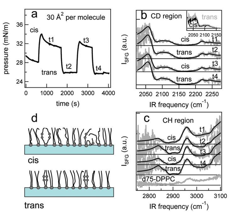 圖7:。結(jié)果:對(duì)于1:5的DT Azo-5P/d75 DPPC混合物,在脂質(zhì)/水界面上,每個(gè)分子的面積為30?2。(a)表面壓力與時(shí)間的關(guān)系。370和450 nm光照射~100秒分別產(chǎn)生cis(高壓)和trans(低壓)狀態(tài)。壓力的微小劇烈波動(dòng)是由于樣品高度的變化,以校正水的蒸發(fā)。順式狀態(tài)下表面壓力的降低可能是由于單層的松弛或膠束或囊泡的形成減少了表面的脂質(zhì)量。(b)相應(yīng)的VSFG光譜(灰色)以及CD區(qū)域的擬合。為了清晰起見(jiàn),對(duì)光譜進(jìn)行了偏移。插圖顯示了相互重疊的反式和順式光譜,以強(qiáng)調(diào)差異。(c)VSFG光譜(灰色)與fits一起引導(dǎo)眼睛進(jìn)入CH區(qū)域。底部曲線顯示了P下純d75 DPPC的光譜~40 mN/m.(d)脂尾方向示意圖。光開(kāi)關(guān)脂質(zhì)的偶氮苯部分用灰色圓圈表示。