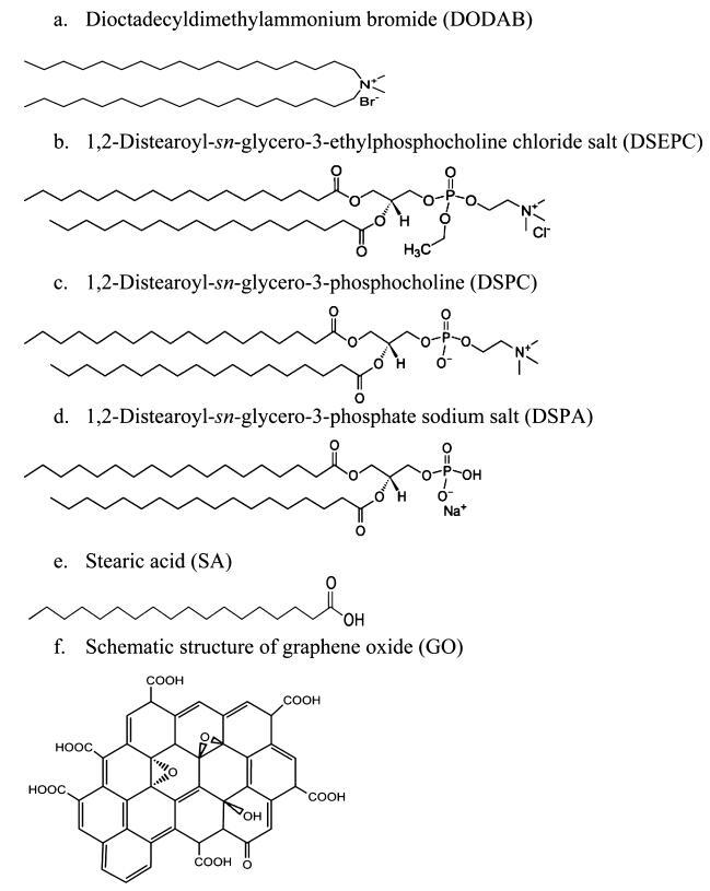 正電荷脂質(zhì)二十八烷基二甲基溴化銨(DODAB)和1,2-二硬脂酰-sn-甘油-3-乙基磷酸膽堿氯化鹽(DSEPC)、中性電荷兩性脂質(zhì)1,2-二硬脂酰-sn-甘油-3-磷酸膽堿(DSPC)和負(fù)電荷脂質(zhì)1,2-二硬脂酰-sn-甘油-3-磷酸鈉鹽(DSPA)購(gòu)自Avanti Polar Lipides(Alabaster,AL)。硬脂酸(SA)購(gòu)自SigmaAldrich(密蘇里州圣路易斯)。由于頭部基團(tuán)中存在陰離子磷酸鹽和陽(yáng)離子季銨中心,DSPC帶中性電荷,如方案1c所示。由于羧基脫質(zhì)子化,SA被認(rèn)為是帶負(fù)電的分子。所有這些脂質(zhì)在非極性尾部都有18個(gè)碳鏈烷基。光譜級(jí)氯仿和甲醇來(lái)自MP Biomedicals(Solon,OH)。單層GO購(gòu)自ACS Material LLC(馬薩諸塞州梅德福德)。所有這些化學(xué)品均未經(jīng)任何進(jìn)一步凈化。化學(xué)結(jié)構(gòu)如圖1所示。實(shí)驗(yàn)中使用的去離子水來(lái)自Modulab 2020水凈化系統(tǒng)(德克薩斯州圣安東尼奧)。去離子水的電阻率、表面張力和pH值在20.0±0.5°C時(shí)分別為18 MΩ·cm、72.6 mN/M和5.6。所有實(shí)驗(yàn)均在恒溫20.0±0.5°C、濕度50±1%的潔凈室(1000級(jí))中進(jìn)行。