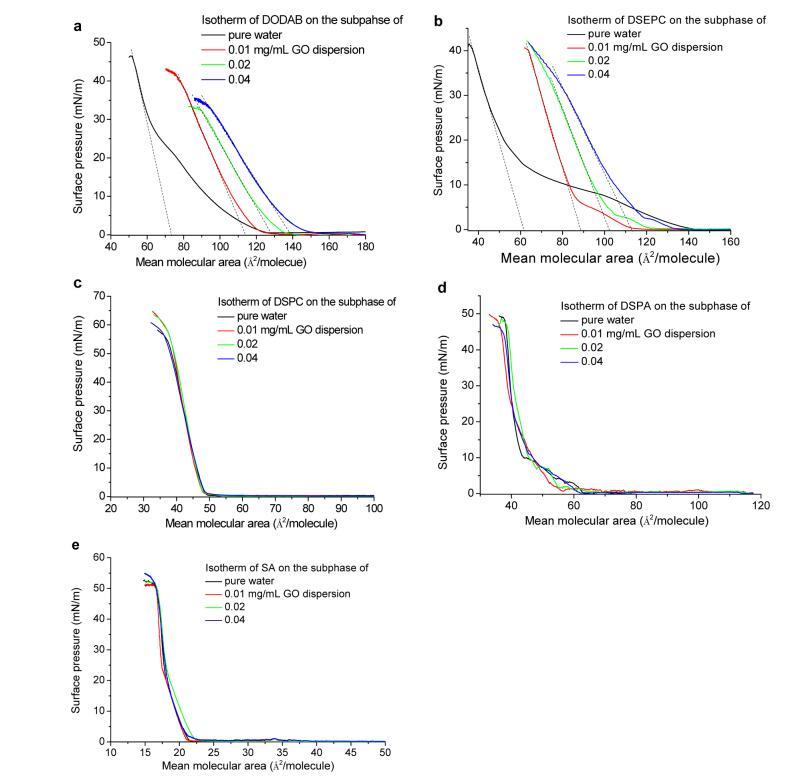圖1顯示了表面壓力?純水和GO水分散體亞相(0.01、0.02和0.04 mg/mL GO)上帶正電的DODAB(a)和DSEPC(b)、帶中性電荷的DSPC(c)、帶負(fù)電的DSPA(d)和SA(e)的面積等溫線。