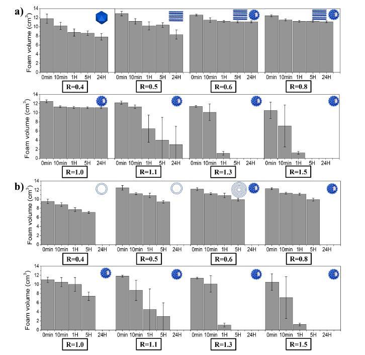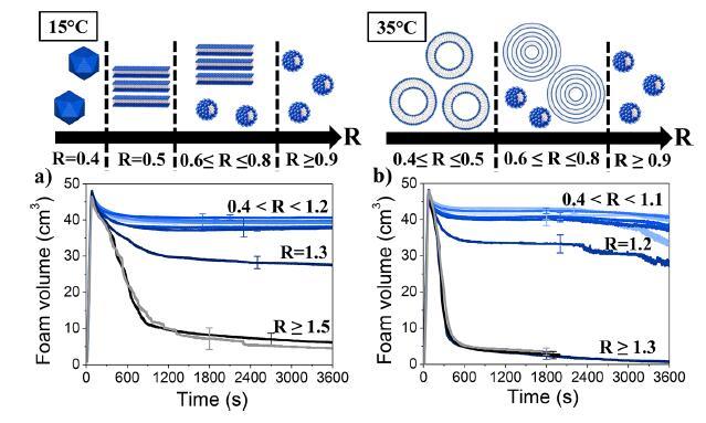 圖5:在兩種溫度下(a)15°C和(b)35°C下,通過手搖動不同摩爾比(R)產生的泡沫體積隨時間的變化。示意圖表示作為R和溫度的函數(shù)的大量自組裝體。