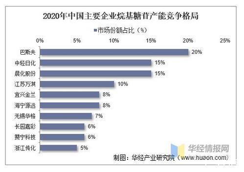 從產能競爭格局來看,2020年中國烷基糖苷行業巴斯夫、中輕日化、晨化股份三者產能合計占比約為50%,分別占比20%、15%、15%。