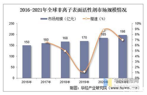 作為新型非離子表面活性劑的APG是在1893年由德國科學家Emil Fisher首次報道合成。非離子表面活性劑主要包括:脂肪醇聚氧乙烯醚、聚醚(含減水劑大單體)、脂肪胺醚、脂肪酸聚氧乙烯酯、烷基酚聚氧乙烯醚、烷醇酰胺和烷基糖苷等系列產品。全球非離子表面活性劑從2016年的150億美元增長至2019年的170億美元,年均復合增長率達4.26%,預計2021年將達到198億美元市場規模。