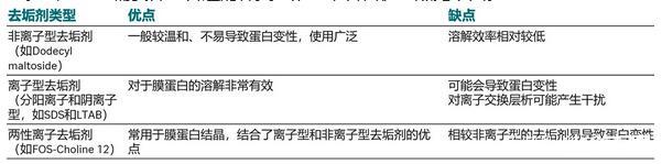 去垢劑的選擇:去垢劑別名表面活性劑、乳化劑、肥皂等等,分為離子型、非離子型和兩性離子型三類。去垢劑是同時(shí)具有親水性和疏水性基團(tuán)的雙極性分子,能夠使磷脂雙分子層解體并釋放膜蛋白,并且為去膜狀態(tài)下的膜蛋白提供穩(wěn)定的疏水環(huán)境。去垢劑也需要篩選合適的種類和濃度,各自優(yōu)缺點(diǎn)見(jiàn)下圖。