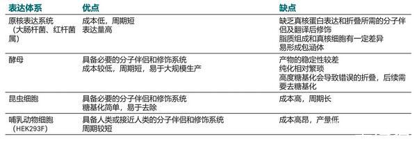 膜蛋白的表達(dá)系統(tǒng):原核表達(dá)(大腸桿菌、紅桿菌屬)、哺乳細(xì)胞(HEK293F)、酵母表達(dá)、昆蟲(chóng)細(xì)胞表達(dá)。不同的表達(dá)系統(tǒng)的優(yōu)缺點(diǎn)見(jiàn)下圖。