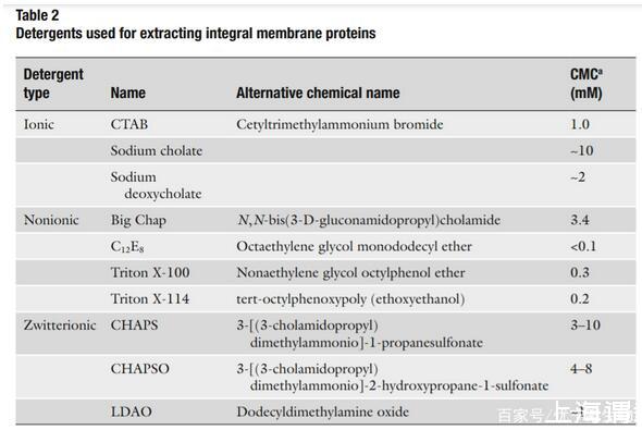 當(dāng)篩選去垢劑時(shí),要注意每個(gè)去垢劑的臨界膠束濃度(CMC)。CMC是指自由的去垢劑分子形成膠束結(jié)構(gòu)需要的濃度。因?yàn)槿芤合喈?dāng)于膜蛋白從細(xì)胞膜上去除進(jìn)入去垢劑膠束,所以CMC是蛋白提取所需的最低濃度。CMC值可參考表二。