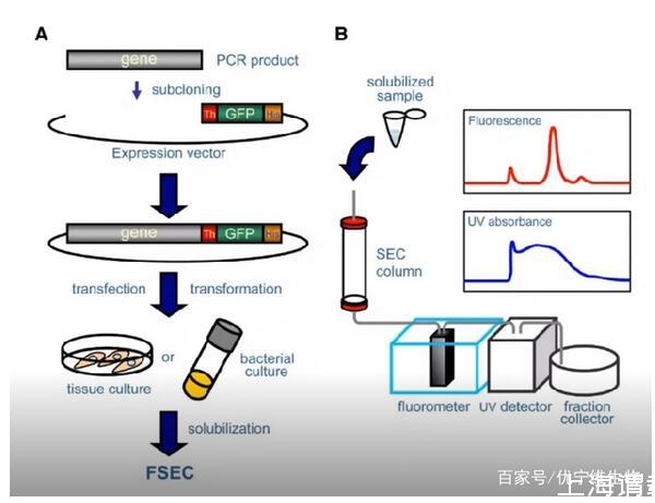 FSEC用于表達(dá)條件和去垢劑的快速篩選。FSEC(Fluorescence-Detection Size-Exclusion Chromatography),又叫熒光檢測(cè)尺寸排阻色譜法。具體方法是將目的基因構(gòu)建在帶有GFP標(biāo)簽的融合表達(dá)載體上,進(jìn)行小量表達(dá)。通過(guò)不同的去垢劑溶解后,然后上樣微量色譜柱,使用AKTA系統(tǒng)的紫外,熒光檢測(cè)器進(jìn)行檢測(cè)(熒光檢測(cè)器需搭配)。由于目的蛋白帶有GFP標(biāo)簽,使用熒光檢測(cè)會(huì)顯示出熒光信號(hào)。通過(guò)峰型和峰面積我們可以檢測(cè)到蛋白表達(dá)和溶解情況。