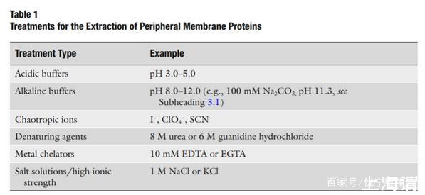 外周膜蛋白可以使用相對(duì)溫和的技術(shù)來(lái)分離,破壞外周膜蛋白和細(xì)胞膜之間的靜電作用或者氫鍵,而不破壞整個(gè)細(xì)胞膜。通常使用的試劑參見(jiàn)表一。使用含有高鹽離子濃度的緩沖液進(jìn)行提取很有用因?yàn)樗麄儠?huì)降低膜蛋白和帶有電荷的脂質(zhì)之間的靜電相互作用。
