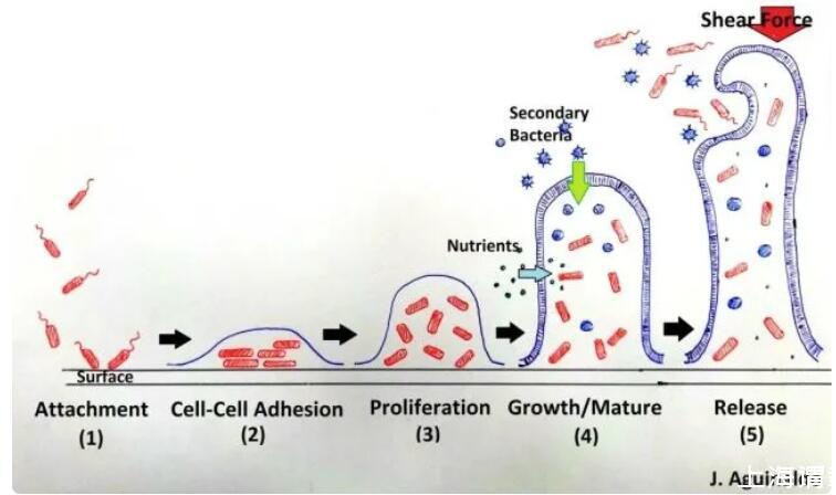 生物膜為微生物分泌物,常見于制藥、食品與個人護理行業的生產或水系統中。生物膜可顯著提高微生物對惡劣環境和消毒劑的抗性,并持續接納浮游微生物,導致生產或水系統中微生物在清洗消毒后依然頻繁超標。