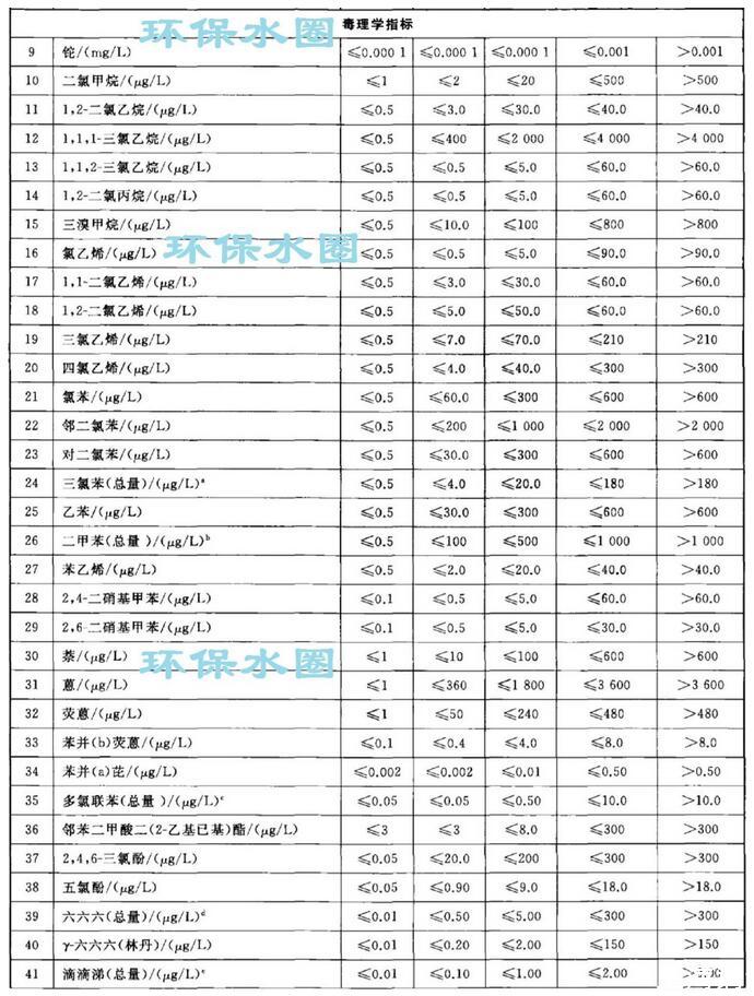 依據(jù)我國(guó)地下水質(zhì)量狀況和人體健康風(fēng)險(xiǎn),參照生活飲用水、工業(yè)、農(nóng)業(yè)等用水質(zhì)量要求,依據(jù)各組分含量高低(pH除外),分為五類。