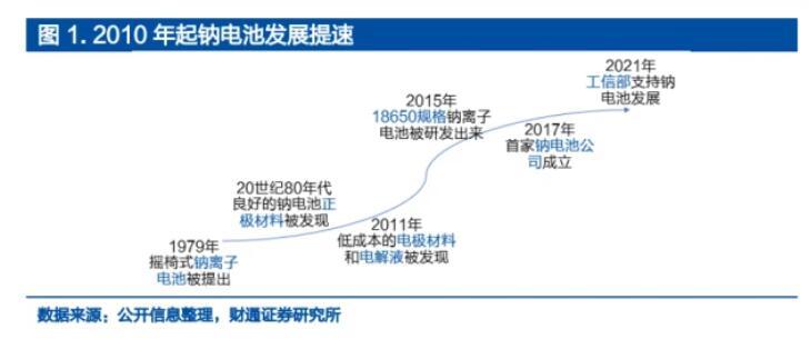 鈉電池隨著產(chǎn)業(yè)化加速,量產(chǎn)在即。1979年法國的Armand提出了“搖椅式電池”的概念,開始鈉離子電池的研究。隨后Delmas和Goodenough發(fā)現(xiàn)了層狀氧化物材料可作為鈉電池正極材料,Stevens和Dahn發(fā)現(xiàn)硬碳材料作為負極有良好的鈉離子嵌脫性能。2010年以來,鈉電池的研發(fā)進程加速。2011年中科院物理所研究員團隊開始了鈉離子電池核心技術(shù)的研發(fā),自此以后開發(fā)出低成本的電極材料。2017年國內(nèi)第一家專注于鈉離子電池研發(fā)和生產(chǎn)的公司中科海鈉成立。2021年寧德時代成功舉行了第一代鈉離子電池線上發(fā)布會。2022年,中科海納和傳藝科技均預計2023年量產(chǎn)其鈉離子電池。