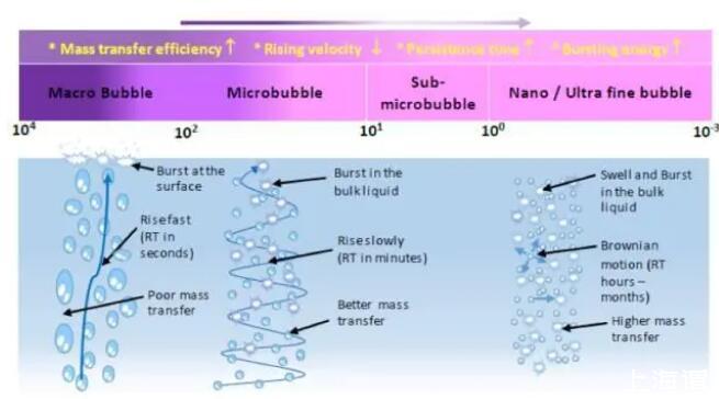 氣泡表面積和氣泡直徑呈負相關關系,(表面積A和直徑D的數學關系A=6/D)。因此同樣體積的氣泡,100納米直徑氣泡表面積是10微米直徑面積的100倍。