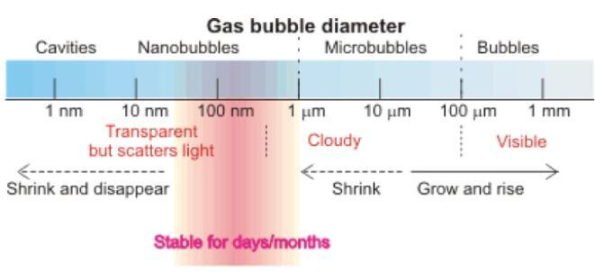 雖然氣泡的研究歷史已經超過半個世紀,但是氣泡的類型和分類一直存在爭議。學術上對氣泡分類主要根據氣泡性質的不同,最常用的指標是氣泡大小、表面特征和氣泡壽命。這些特征主要決定于氣泡大小,因此許多學者把氣泡大小作為唯一分類標準。按照這個標準,氣泡被分為大氣泡、微米氣泡、亞微米氣泡或納米氣泡,也有采用更通俗分類為大氣泡、小氣泡和超小氣泡。雖然學者們對氣泡的大小范圍具體有不同看法,但大多數同意微氣泡直徑應該在10-100微米的范圍,1-10微米為亞微米氣泡,10-1000納米為納米氣泡。