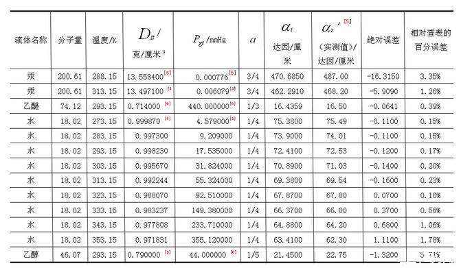 其中N0為阿伏伽德羅數(shù),M為摩爾質(zhì)量,Dit是液體的密度,Dgt是液體飽和蒸汽的密度,a為與液體種類相關的常量。為驗證(1)式的正確性,對汞、乙醚、水、乙醇等實際液態(tài)物質(zhì)的表面張力系數(shù)進行理論計算,并與實驗實測值'相比較,列于下表【3】: