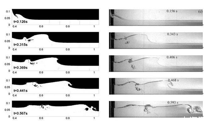 潰壩仿真結果(左)和實驗結果[19](右)對比