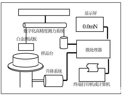 當(dāng)白金板接觸到樣品液后,樣品液的表面張力會(huì)將白金板往下拉。基于高精度電子天平的數(shù)字化檢測(cè)系統(tǒng)檢測(cè)到這個(gè)微小的力并傳到微處理機(jī)進(jìn)行處理。