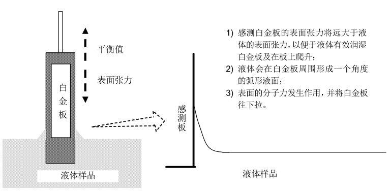 具體測(cè)試過(guò)程中,白金板法的測(cè)試步驟為:(1)將白金板逐漸浸入液體;(2)在浸入液體表面狀態(tài)下,由感應(yīng)器感測(cè)平衡值;(3)將感應(yīng)到的平衡值轉(zhuǎn)化為表面張力值,并顯示出來(lái)。