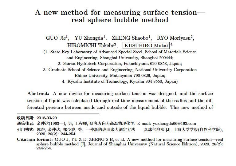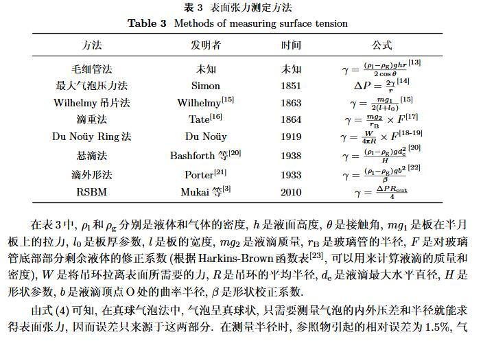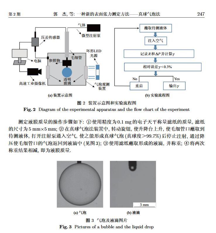 設計了一個新的表面張力測定裝置,通過實時測定液膜氣泡的半徑及其內外壓差來獲得被測液體的表面張力。該測定液體表面張力的方法簡稱為真球氣泡法(real sphere bubblemethod,RSBM)。對十二烷基硫酸鈉(sodium dodecyl sulfate,SDS)溶液的表面張力進行了測定,結果與文獻值吻合,且測定裝置的絕對精度為98.2。通過檢測到的液膜氣泡突然長大所需要的最大壓差值及其表面積隨時間的變化過程,定量分析溶液起泡難易程度及氣泡大小的關系。