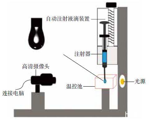懸滴法是利用滴外形測定表面張力的一種方法,基于數(shù)字成像技術(shù),是一種現(xiàn)代的完全數(shù)字、計算機化的方法,是一種絕對的測量方法[13,14,15]。該種方法簡單、直觀、誤差小,往往只需準確校正圖像放大比例,且可同時評估靜態(tài)表面張力及動態(tài)表面張力。