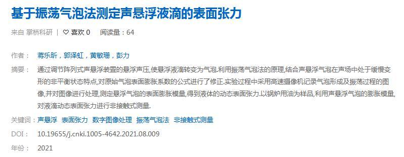 > 新型懸滴實驗系統的研制與二甲基亞砜/甲醇混合物表面張力測量(一)