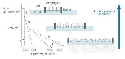 在進(jìn)行典型的等溫壓縮測(cè)試時(shí),單分子層先從二維的氣相(G)轉(zhuǎn)變到液相(L)最后形成有序的固相(S)。在氣相中,分子間的相互作用力比較弱;當(dāng)表面積減小,分子間的堆積更為緊密,并開(kāi)始發(fā)生相互作用;在固相時(shí),分子的堆積是有序的,導(dǎo)致表面壓迅速增大。當(dāng)表面壓達(dá)到最大值即塌縮點(diǎn)后,單分子層的堆積不再可控。