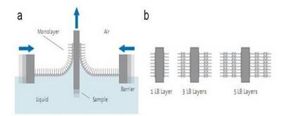 圖2(a).LB沉積過(guò)程示意圖;(b).多層單分子膜的制備
