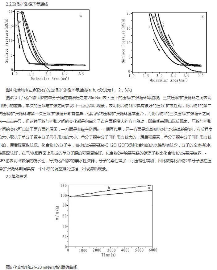 合成了雙頭基多氟烷基兩親杯芳烴化合物1和2,并對該化合物在空氣/水相界面的成膜性能進行了研究,利用表面壓一面積(π-A)等溫線、壓縮/擴張循環(huán)等溫線與膜穩(wěn)曲線,紫外光譜和原子力顯微鏡對組裝的LB膜進行了結(jié)構(gòu)表征,表明化合物1和2在空氣/水相表面均能很好的形成穩(wěn)定的Langmuir膜,取代基碳原子數(shù)的增加使得化合物2的Langmuir膜單分子面積增加,崩潰壓相應減少,組裝的LB膜均為H-聚集體,結(jié)構(gòu)均勻,穩(wěn)定性好。