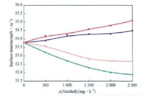 本工作采用乙醇、正丁醇、乙二醇、1,2-丙二醇、正辛醇和十二醇為添加劑,研究了不同醇對BHEC水溶液表面張力的影響。