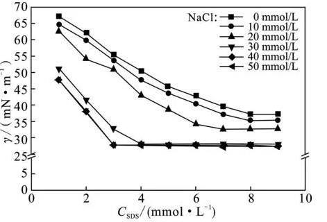 三種無機鹽的加入可以降低表面張力;當NaCl、CuCl2,Fe(NO3)3的濃度在40,1.25,1.25 mmol/L以下范圍內,在一定量SDS表面活性劑溶液濃度下,隨著無機鹽濃度的增加,表面張力逐漸減??;當超過無機鹽添加濃度上限后,在一定量的SDS表面活性劑溶液濃度下,隨著無機鹽濃度的增加,表面張力將達到穩定。同時,無機鹽濃度的增加可以降低表面張力達到最低時所對應的SDS表面活性劑溶液濃度值(Ct),各體系下的Ct即為cmc值,當三種無機鹽添加濃度達到上限值后,表面張力達到最小值時所對應的SDS表面活性劑溶液濃度都是3 mmol/L,加入Fe(NO3)3、CuCl2和NaCl之后,溶液的表面張力由37.29 mN/m分別降至21.35,23.44,27.53 mN/m。