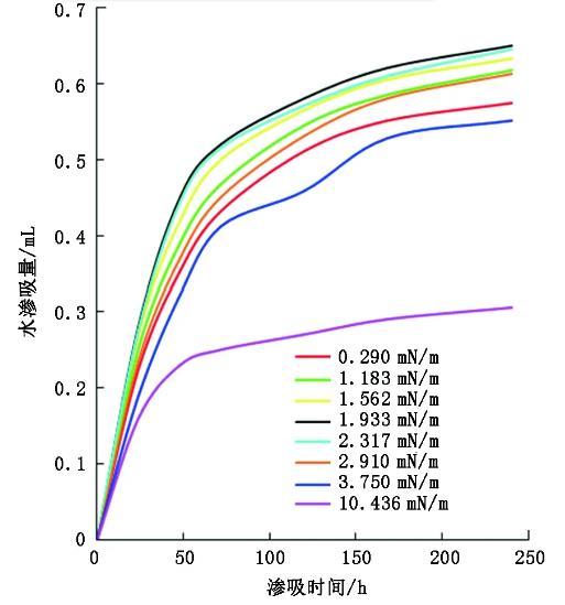 圖2界面張力對(duì)最終水滲吸體積的影響(試驗(yàn)結(jié)果)