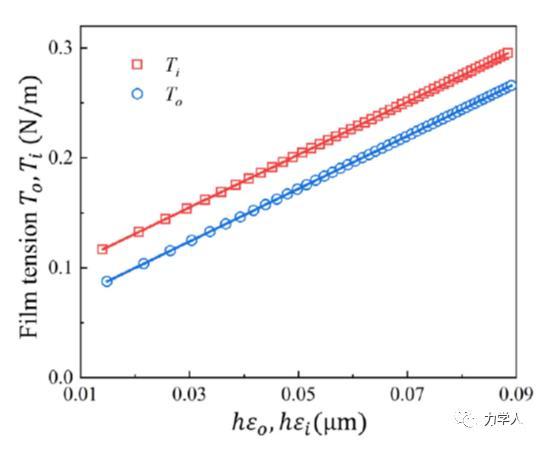 基于該平衡構(gòu)型的解析解,本研究發(fā)現(xiàn)薄膜在接觸線附近的彈性應(yīng)變可以由薄膜的鼓包角解析給出。由此,本文給出了在一般條件下,薄膜在接觸線附近的彈性應(yīng)變隨鼓包角的解析關(guān)系。圖3表明,基于該解析關(guān)系給出的薄膜彈性應(yīng)變可以很好的描述薄膜總張力隨薄膜厚度及接觸線附近應(yīng)變的演化規(guī)律。基于此,本文提出了采用線性外推薄膜總張力隨薄膜厚度和接觸線附近薄膜應(yīng)變乘積的方法來確定固體表面張力的方案。