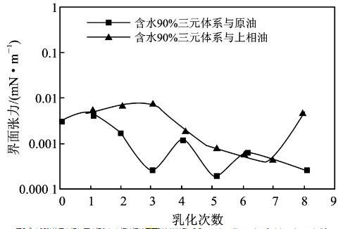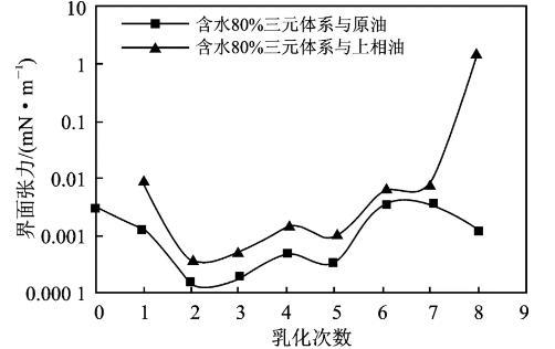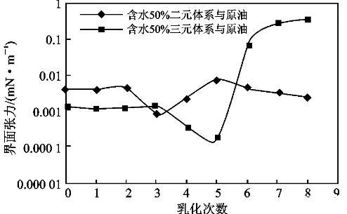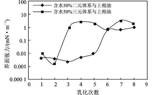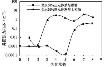 從總體上看,水相與原油間的界面張力低于其與上相油間的界面張力,在乳化第6次以后兩者開始趨同。說明乳化會導致油相中的組成發(fā)生變化,進而導致油相性質發(fā)生變化。因此在復合驅驅替的適當時機應對驅油體系的配方進行相應調整。